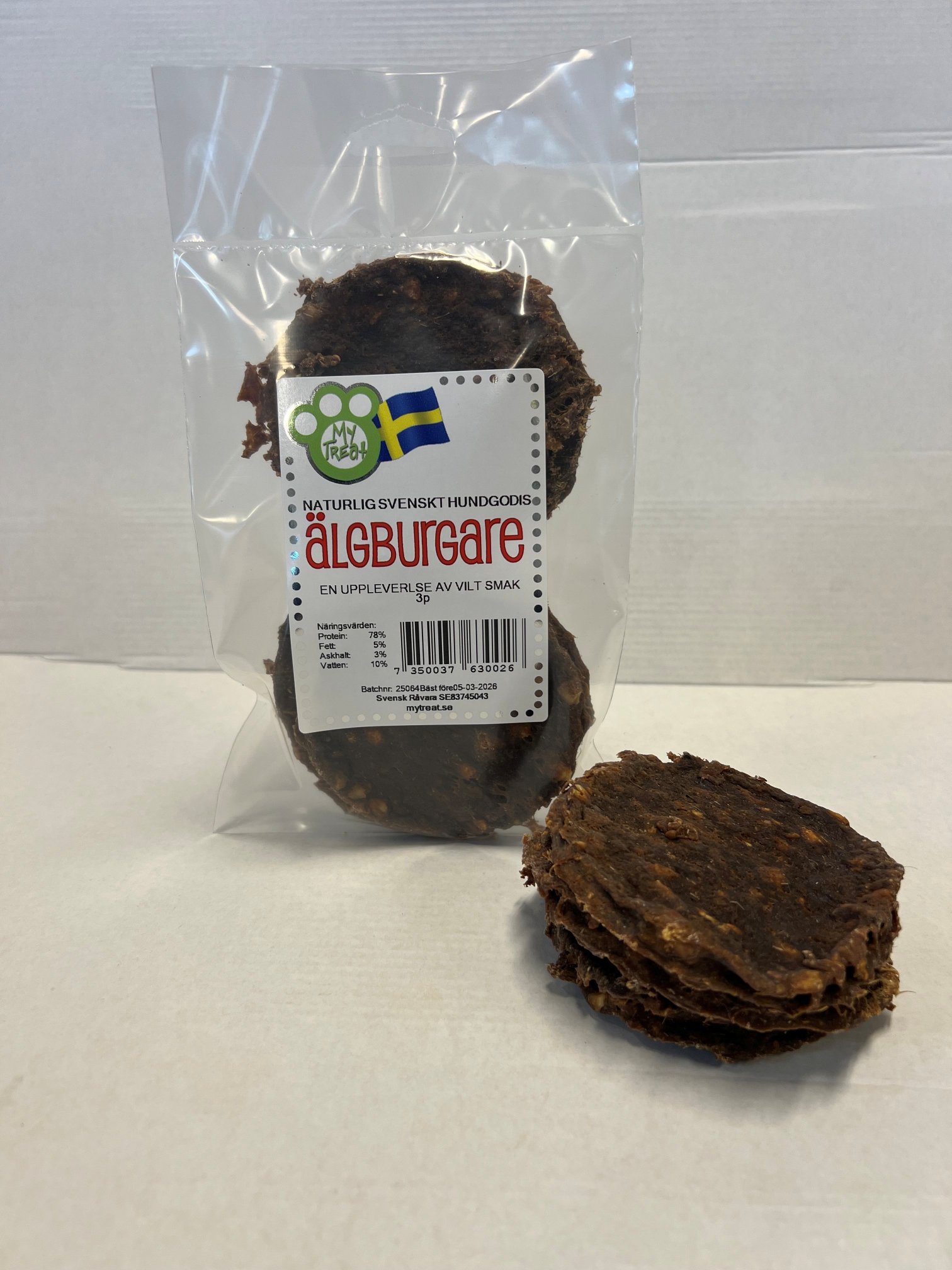 Torkad svensk Älgburgare här får din hund en äventyrlig smak från älgkött. Passar till alla hundar som tycker om vilt. Går att bryta till mindre bitar, ett mjukt tugg. Mild mot känslig mage. Tuggmotstånd: 2 av 5