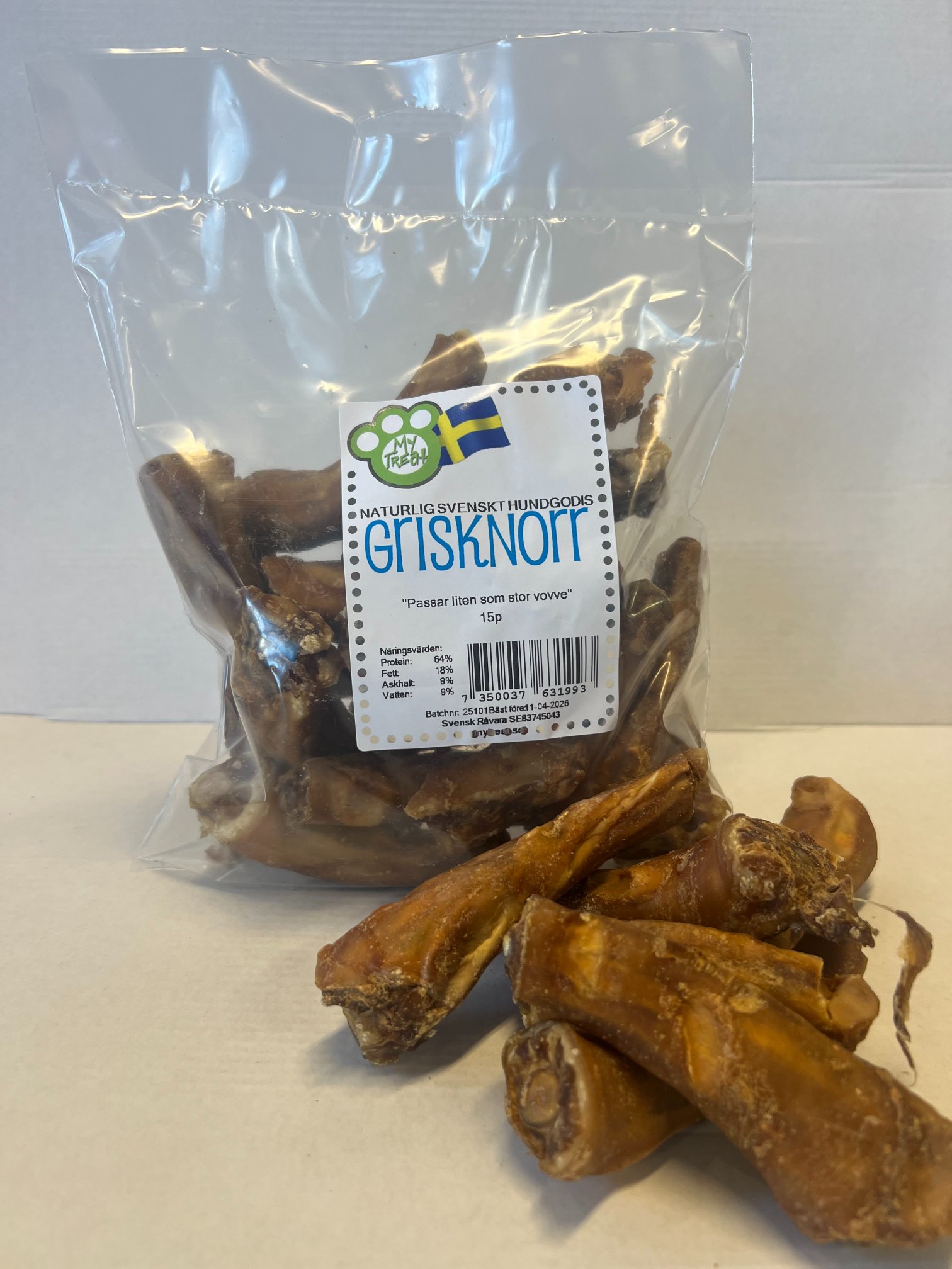Svensk Grisknorr i bit är ett segt och knaprigt tugg som är mycket omtyckt av våra hundar. Här får hunden ett tugg som mellanmål om hunden är sugen på något gott innan måltid. Eller bara sugen på något gott. Passar alla hundar. Tuggmotstånd: 3-5