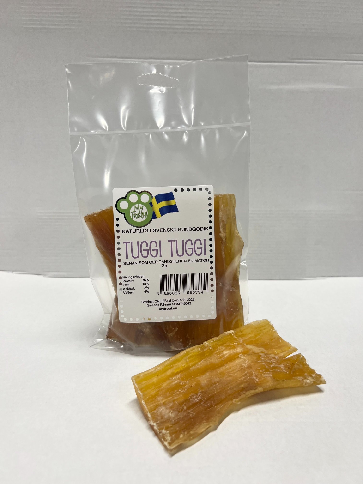 Tuggi tuggi är en nacksena på nöt djuret som tvättas och sedan torkas. Bitarna är ca 12cm långa. Svensk råvara, Naturliga smakämnen, Fritt från spannmål och färgämnen, Inga konstgjorda smakämnen eller konserveringsmedel.